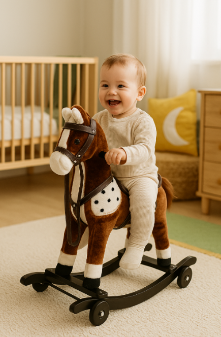 Calutul se balanseaza datorita miscarii inainte-inapoi a copilului, pe cele doua baze atasate.
