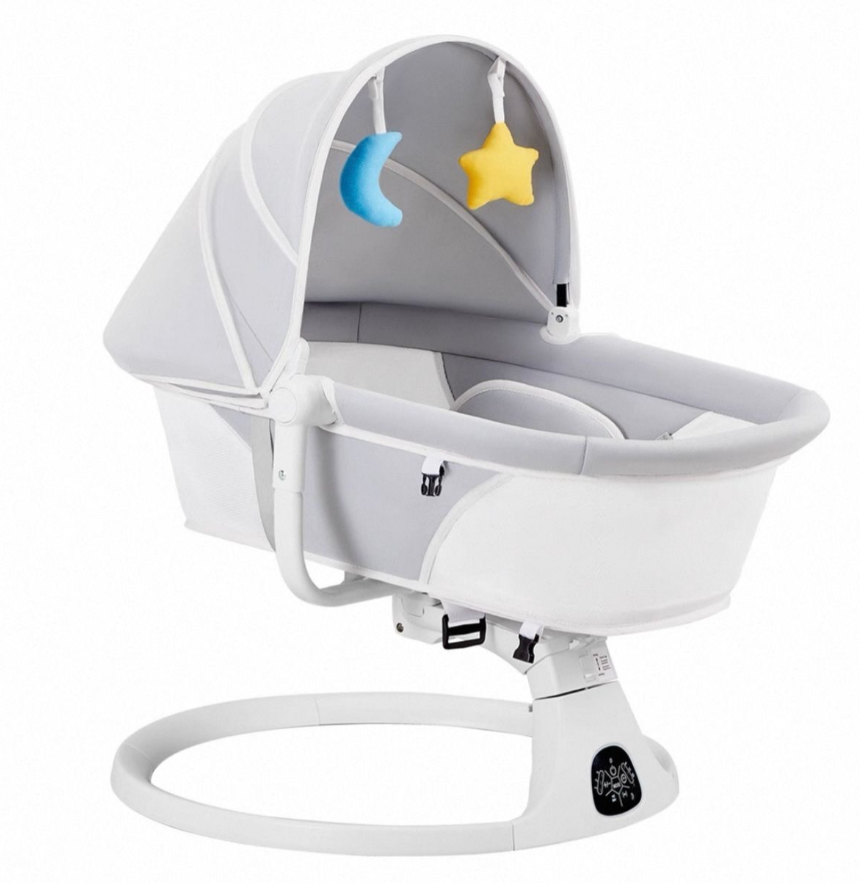 Leagan Electric, Balansoar si patut pentru bebelusi , 3 Trepte Balans, Muzical, Conexiune Bluetooth, Telecomanda, Jucarii de Plus, Cu Acoperis Rabatabil si Plasa insecte, Bej