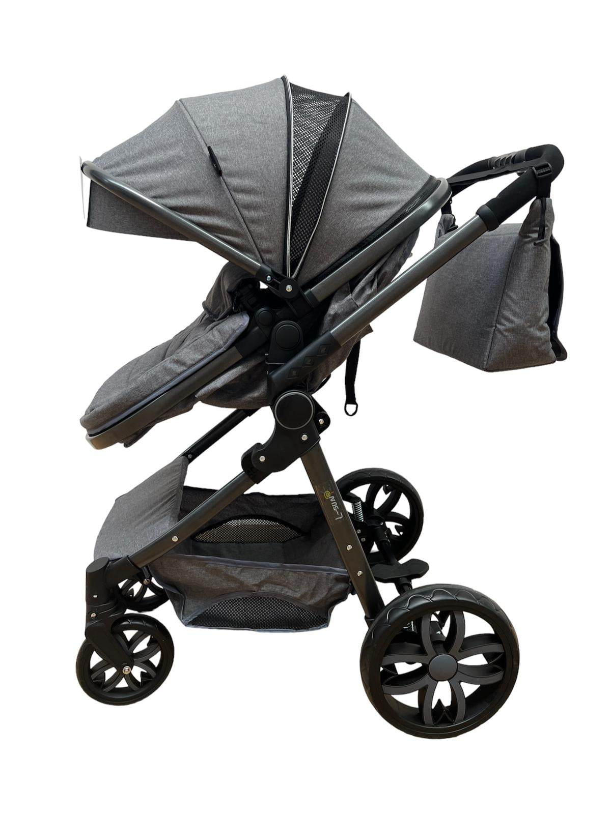 Carucior 2 in 1, Cu landou Reversibil, copertina extensibila, geanta pentru scutece, strangere compacta, plasa de insecte si saltea bambus, gri
