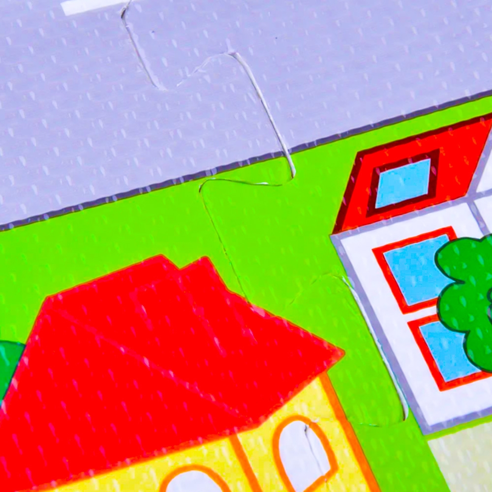 - Covorasul este termoizolant si impermeabil, vesel colorat, imprimat cu un orasel cu strazi, masinute si animalute, de dimensiuni 120x120x1 cm.