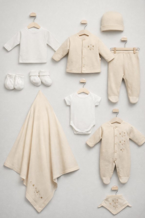 Acest set complet conține tot ce ai nevoie pentru a-ți îmbrăca bebelușul cu stil și confort: