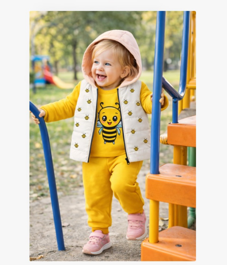 Treningul pentru copii din 3 piese este alegerea ideală pentru sezonul rece, oferind confort, căldură și un design adorabil. Setul include pantaloni lungi galbeni, bluză cu mânecă lungă și vestă cu glugă, decorată cu imprimeu vesel cu albinute. Materialul moale și plăcut la atingere asigură libertate de mișcare, fiind perfect pentru joacă, plimbări sau activități zilnice.