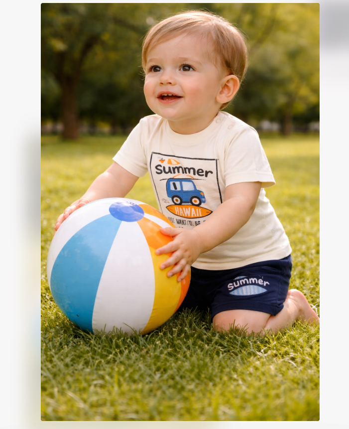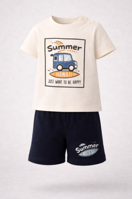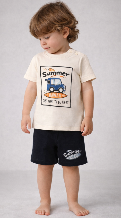 Setul este format din două piese: un tricou simpatic și o pereche de pantaloni scurți asortați. Designul este gândit pentru a fi ușor de îmbrăcat și dezbrăcat, facilitând schimbările rapide de scutec și pregătirea pentru joacă. Disponibil în mărimile 9-12-18-24 luni, veți găsi cu siguranță potrivirea perfectă pentru micuțul dumneavoastră.