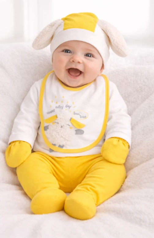 Îmbracă-ți bebelușul în confort cu acest set adorabil, fabricat din bumbac 100%! Perfect pentru pielea sensibilă, setul este hipoalergenic și nu conține substanțe periculoase.