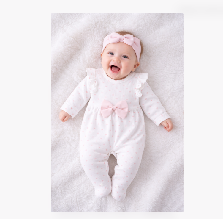 Salopetă delicată pentru bebeluși, realizată din material moale și confortabil, decorată cu inimioare roz și completată de o bentiță adorabilă. Ideală pentru fotografii, ocazii speciale sau purtare zilnică.
