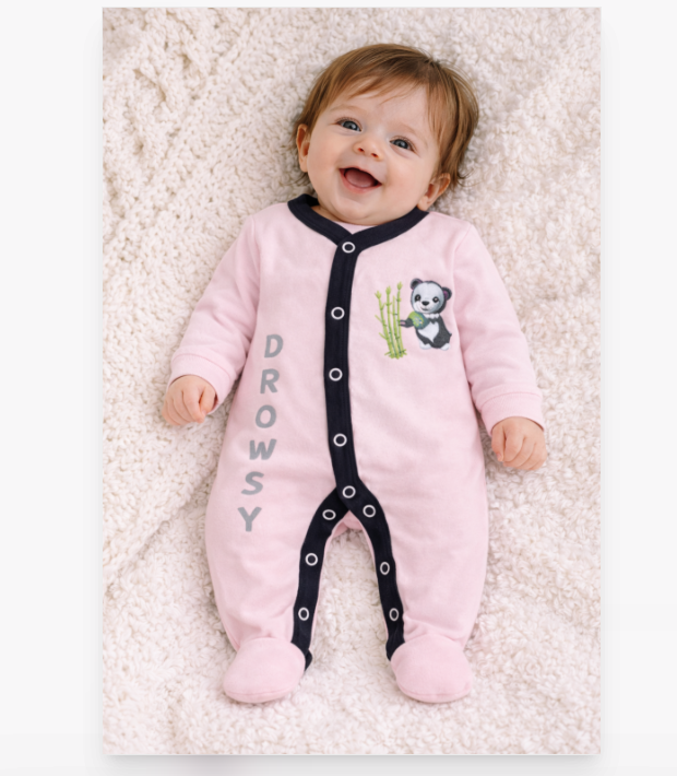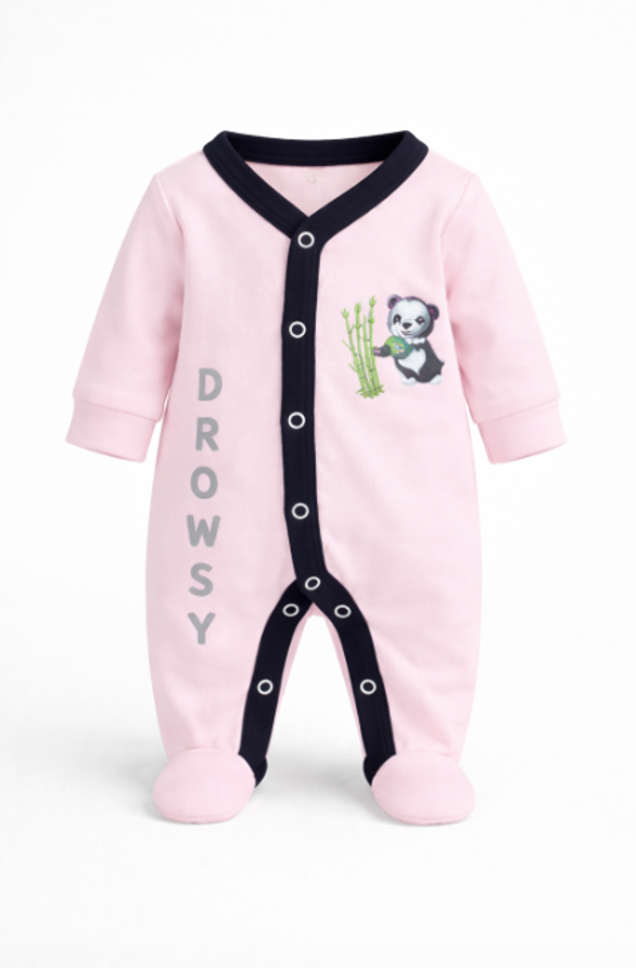 Designul practic cu capse pe toată lungimea permite îmbrăcarea rapidă și schimbarea ușoară a scutecului, fără disconfort pentru copil. Modelele sunt decorate cu imprimeuri adorabile – ursuleți, panda și mesaje vesele – perfecte pentru un look modern și jucăuș.