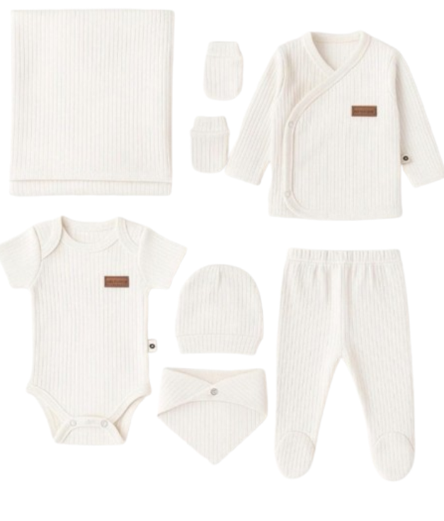 Perfect pentru primele luni, pentru scos din maternitate si pentru uzul zilnic, setul este compus din paturica, manusele, pantalonasi cu botos, bluzita, barbita, body si caciulita.