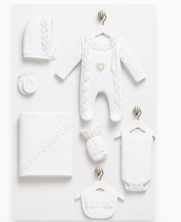 Descoperă un set complet pentru bebeluși, realizat din bumbac moale de înaltă calitate, perfect pentru pielea delicată a nou-născuților. Acest set roz pentru fetițe include salopetă elegantă cu detalii fine din dantelă, căciuliță asortată, mănuși, botoșei, body, bavețică și păturică, toate create pentru confort maxim și un aspect rafinat.