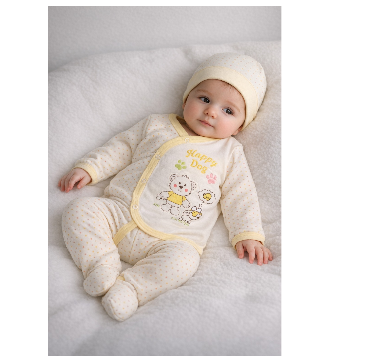 Realizat din bumbac pieptanat, setul contine pantaloni, bluzita si caciulita.