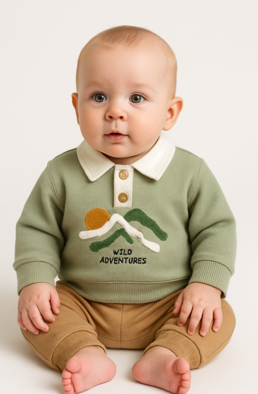 Descoperă setul perfect pentru micuțul tău aventurier! Setul din bumbac, format din top și pantaloni, este ideal pentru joacă și plimbări.