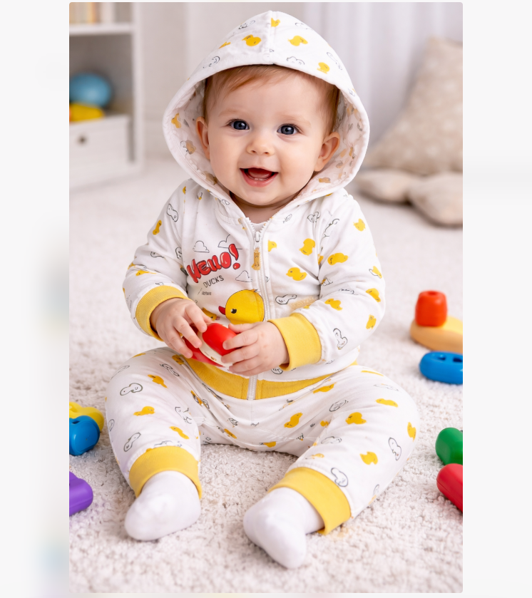 Oferă-i bebelușului tău un outfit adorabil și practic cu acest set complet din 3 piese, perfect pentru sezonul mai răcoros. Designul vesel cu rățuște galbene și detalii moderne transformă fiecare zi într-o experiență plină de culoare, în timp ce materialul moale asigură confort maxim și libertate de mișcare.