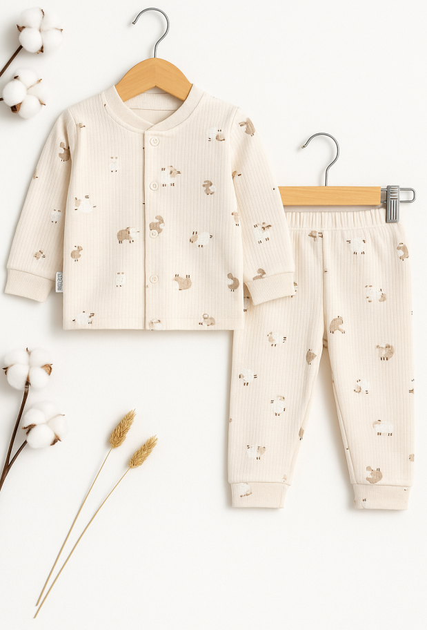 Setul este confecționat integral din bumbac 100% pieptănat, un material incredibil de moale și delicat cu pielea bebelușului. Bumbacul pieptănat este superior bumbacului obișnuit, deoarece este mai fin, mai rezistent și mai puțin predispus la scame, asigurând un confort sporit și o durabilitate remarcabilă.