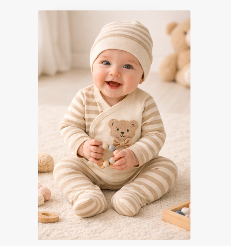• Body: Un body moale și ușor de îmbrăcat, perfect pentru a menține bebelușul confortabil în orice moment.