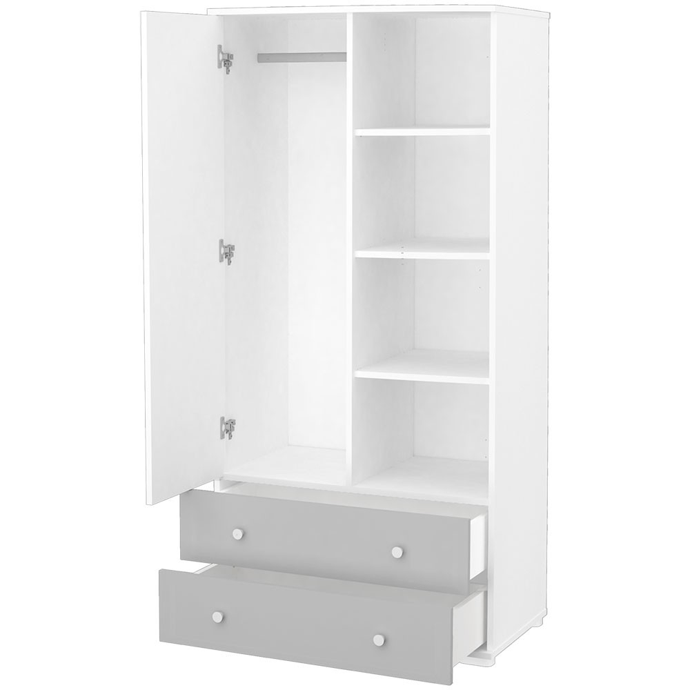 Dulapul a fost proiectat sa fie usor de aranjat si practic de folosit. in spatele usii se gasesc rafturi si carlige pentru umerase, iar jos se afla doua sertare care ajuta la organizarea lucrurilor