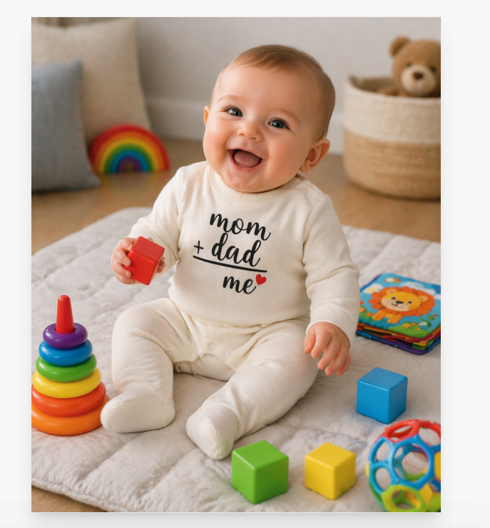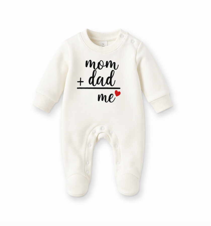 Designul modern „Mom + Dad = Me” adaugă un plus de personalitate și o face alegerea perfectă pentru ședințe foto, cadouri sau primele amintiri speciale.