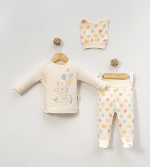 Set adorabil pentru bebeluși de 0-3 luni, compus din bluziță crem cu imprimeu ursuleț și baloane colorate, pantaloni cu buline pastel și căciuliță asortată. Ținuta este ideală pentru nou-născuți, oferind confort și un design jucăuș, perfect pentru ședințe foto sau ținute de zi cu zi. Materialul moale și delicat este potrivit pentru pielea sensibilă a bebelușilor, iar culorile pastel creează un look modern și plăcut.