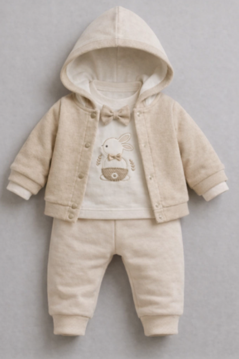 Confort și практичност: Setul include o jachetă călduroasă și moale, un body cu nasturi, ușor de îmbrăcat și dezbrăcat, și pantaloni. Materialul jersey asigură o textură plăcută la atingere și o respirabilitate optimă, menținând bebelușul confortabil pe tot parcursul zilei.