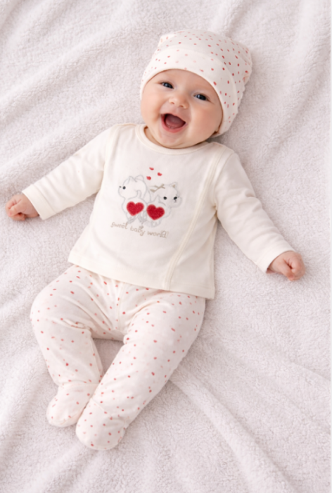 Set adorabil pentru bebeluși de 0-3 luni, compus din bluziță crem cu imprimeu colorat, pantaloni cu buline pastel și căciuliță asortată. Ținuta este ideală pentru nou-născuți, oferind confort și un design jucăuș, perfect pentru ședințe foto sau ținute de zi cu zi. Materialul moale și delicat este potrivit pentru pielea sensibilă a bebelușilor, iar culorile pastel creează un look modern și plăcut.