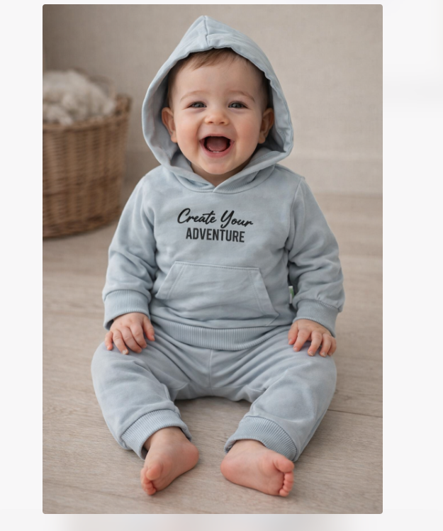 Descoperă confortul și stilul perfect pentru micuțul tău cu acest set sport pentru bebe, compus din hanorac cu glugă și pantaloni asortați, în nuanță modernă de turcoaz. Realizat din bumbac moale și plăcut la atingere, setul oferă libertate de mișcare și confort pe tot parcursul zilei. Hanoracul este prevăzut cu buzunar tip kangaroo și mesaj imprimat „Create Your Adventure”, adăugând un plus de personalitate ținutei. Pantalonii au talie elastică și manșete pentru o fixare lejeră și practică.