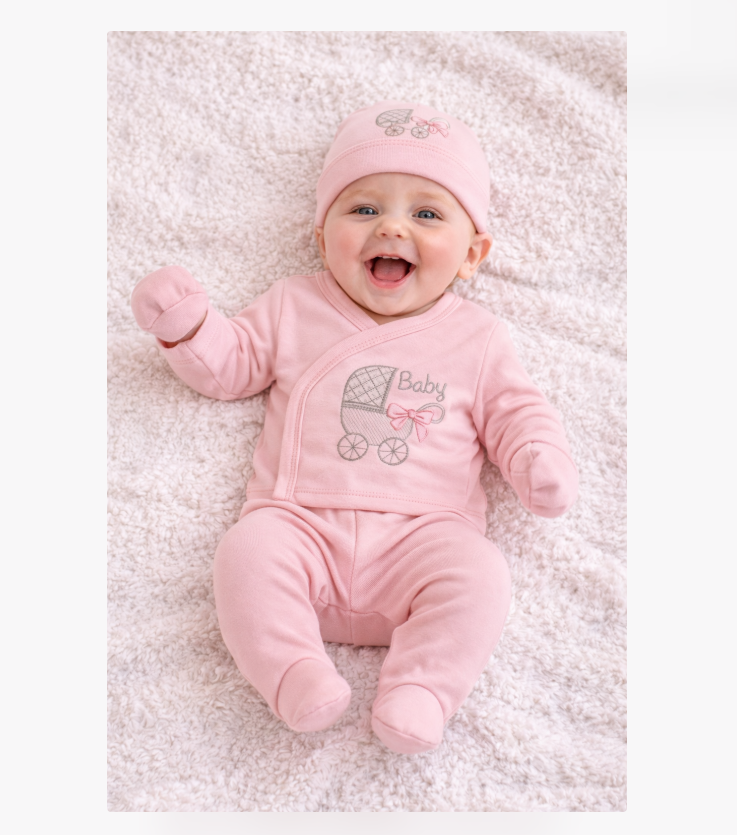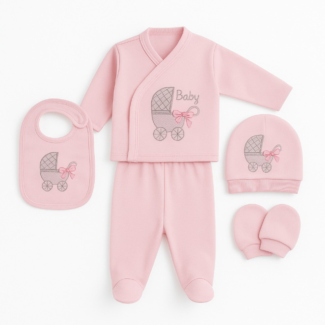 Compleu 5 piese, 0-3 luni, model primul carucior, roz