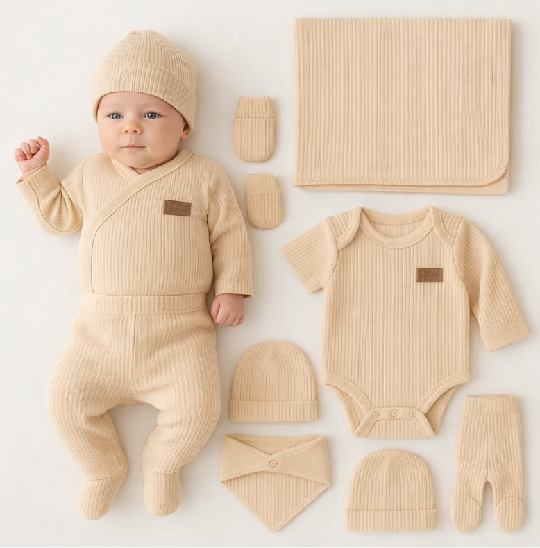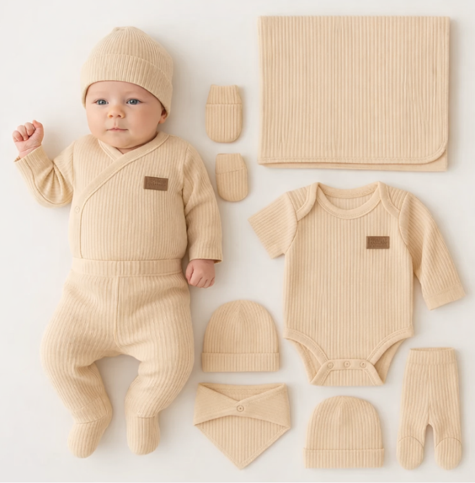 Perfect pentru primele luni, pentru scos din maternitate si pentru uzul zilnic, setul este compus din paturica, manusele, pantalonasi cu botos, bluzita, barbita, body si caciulita.