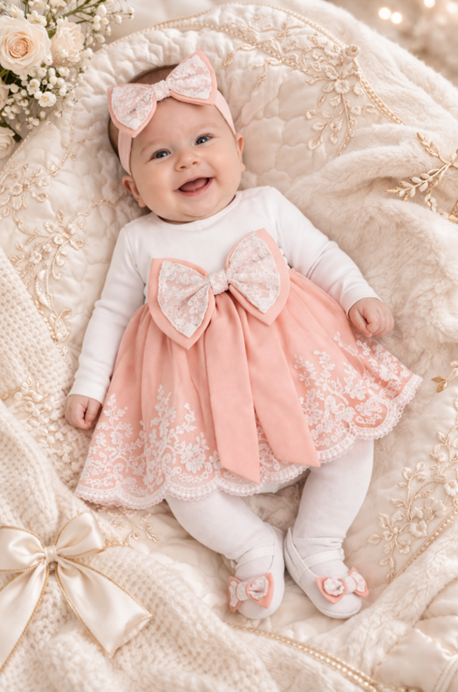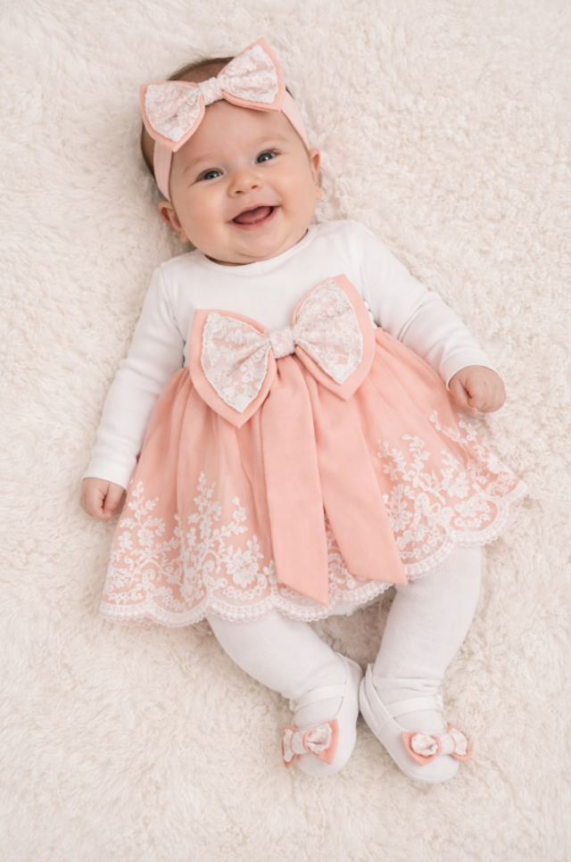 • Rochie: Rochița inclusă în set adaugă un plus de eleganță și rafinament. Designul său adorabil și materialul fin o fac ideală pentru ocazii speciale sau pur și simplu pentru a transforma fiecare zi într-o sărbătoare.