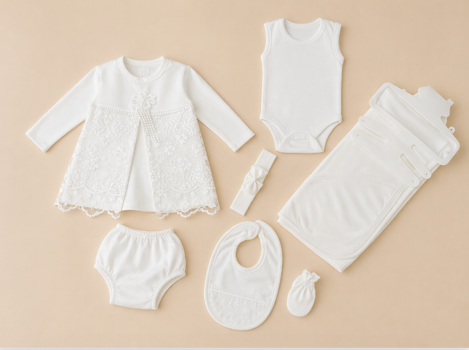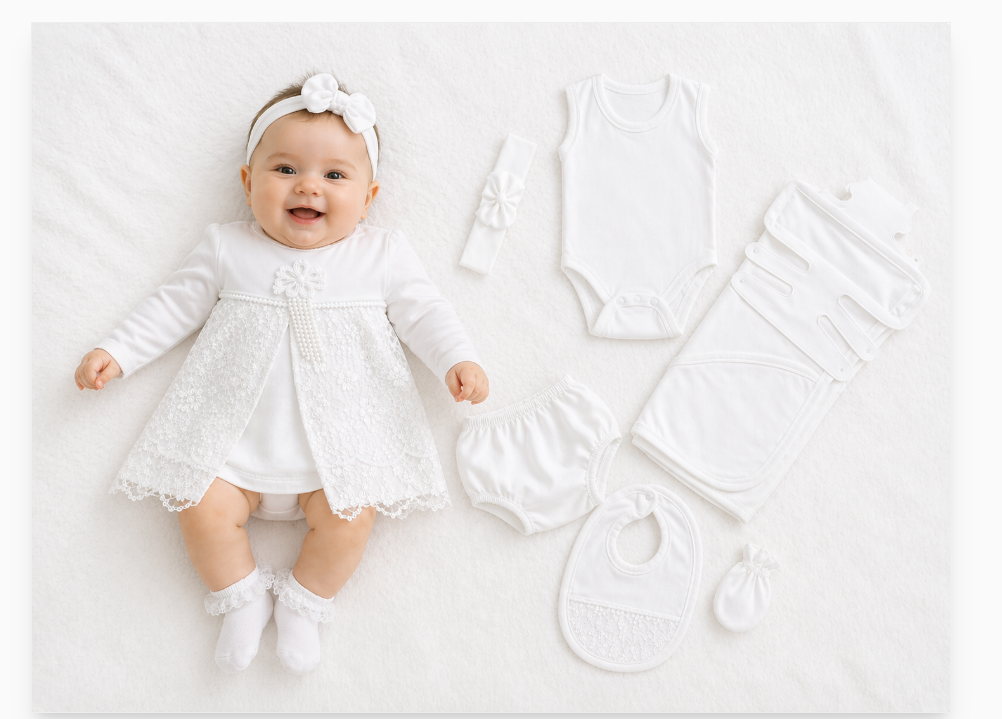Set premium pentru botez fetiță, realizat din materiale fine și confortabile, ideal pentru un eveniment special sau ședințe foto elegante. Ținuta include rochiță delicată cu dantelă, bentiță asortată și accesorii complete, toate într-un design rafinat, alb imaculat.