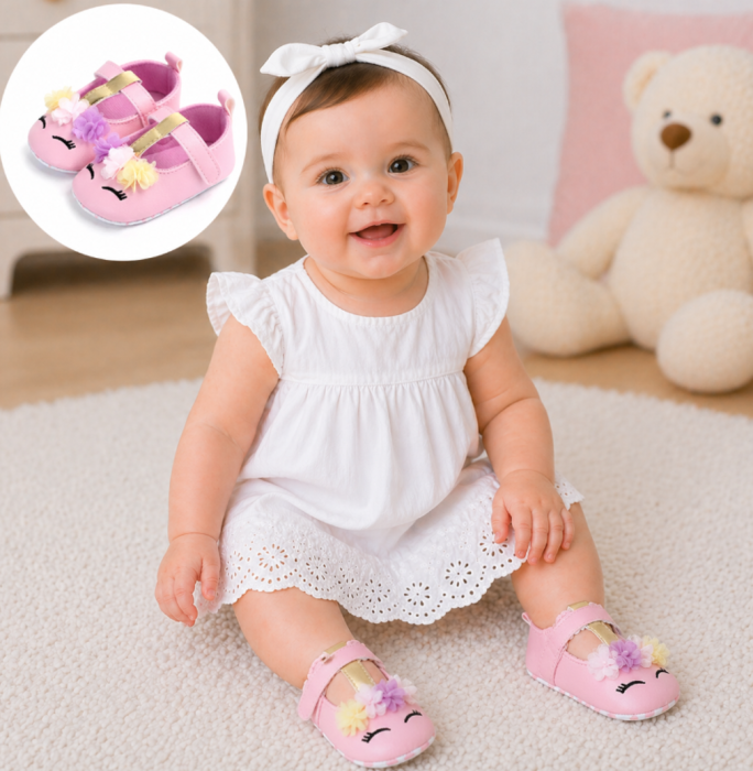 Pantofiori pentru fetite din material tip piele ecologica, cu doi ochisori si floricele din tul colorate aplicate. Se inchid cu bareta cu arici intr-o parte.