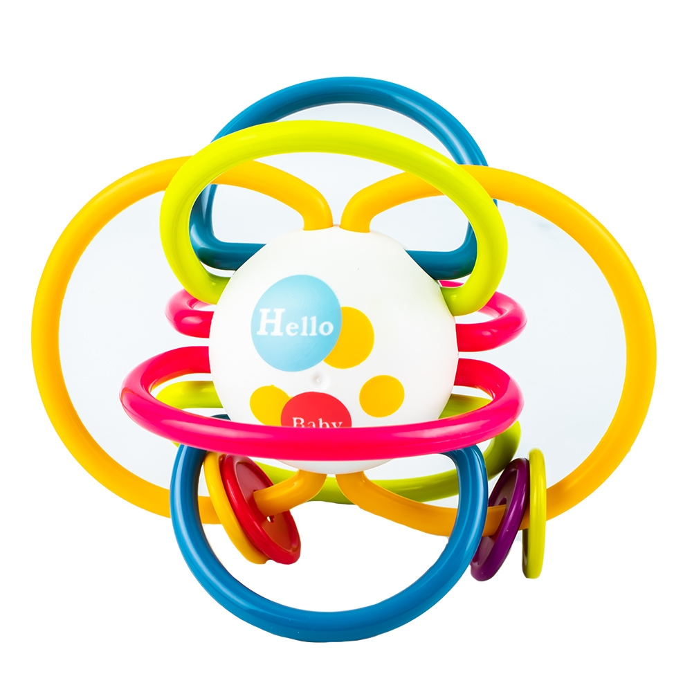 - Forma jucariei de dentitie, sfera cu inele, a fost conceputa astfel incat sa fie apucata cu usurinta, precum si sa fie tinuta facil de mainile micute Pe doua din inele sunt plasate patru discuri. In interiorul sferei sunt bilute zornaitoare.