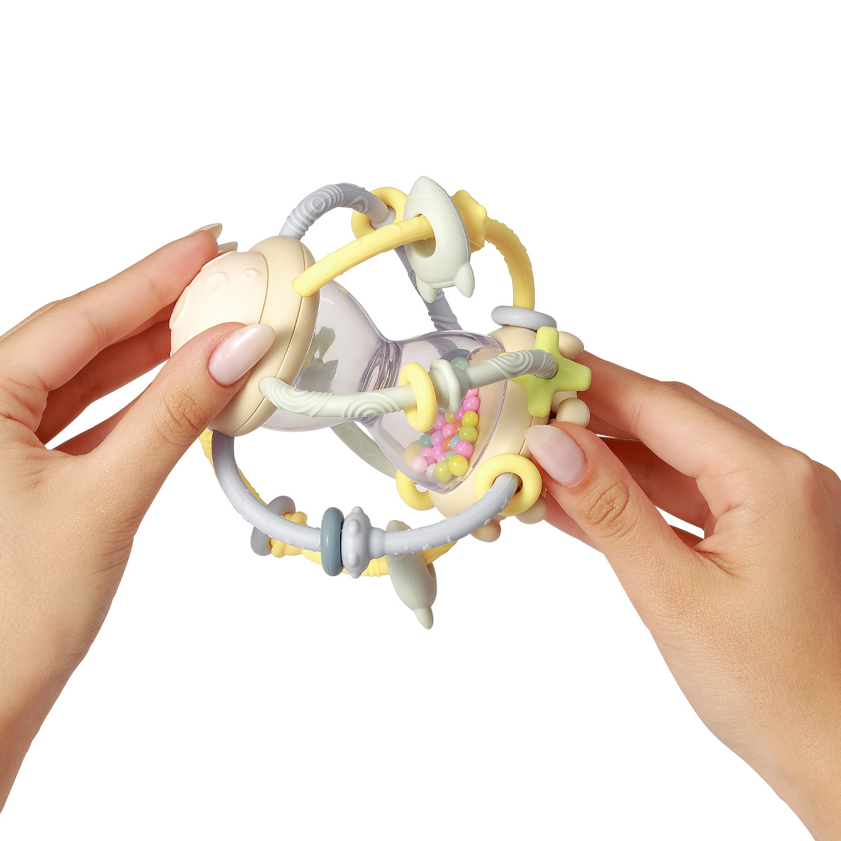 În interiorul zornăitoarei cu jucărie de dentiție se află o clepsidră cu mărgele. Mărgelele colorate care se mișcă creează un spectacol fascinant și atrag atenția. Micuțul tău învață observarea și relațiile cauză-efect.