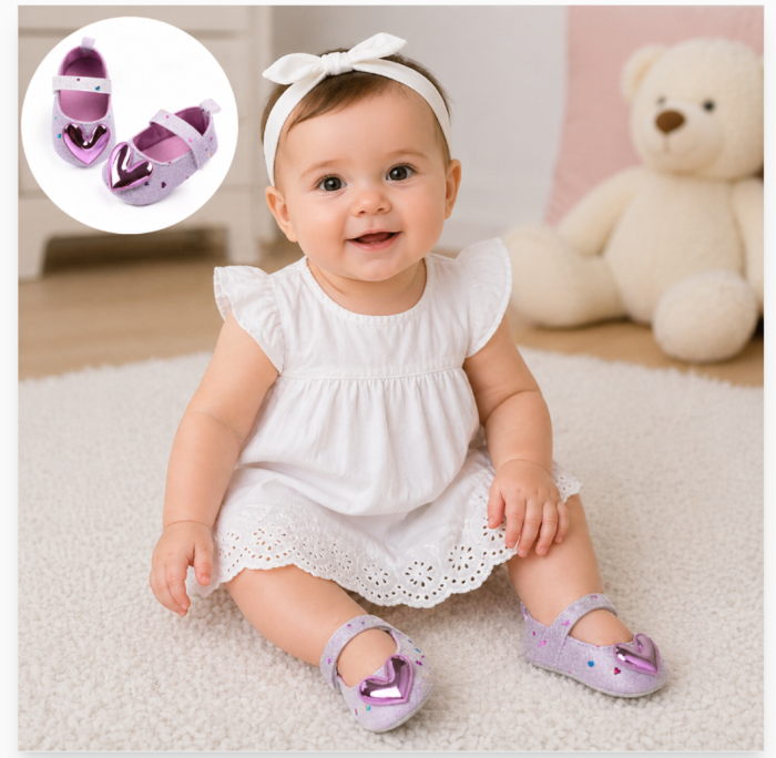Pantofiori pentru bebelusi de culoare lila, cu design modern si inima decorativa pe varf.