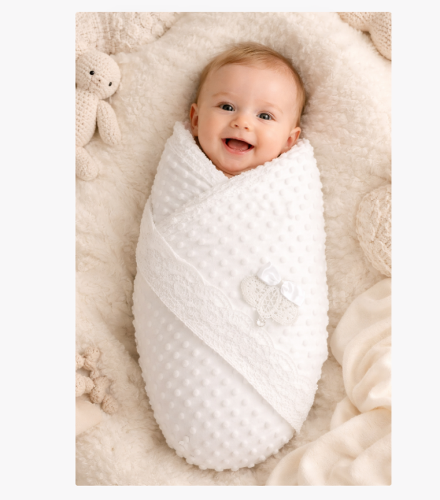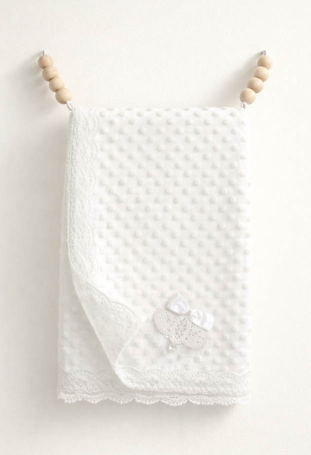 O păturică delicată și rafinată, creată special pentru momentele prețioase din primele zile de viață. Realizată din material minky moale cu textură reliefată (buline), această păturică albă oferă confort maxim și protecție pentru pielea sensibilă a bebelușului.