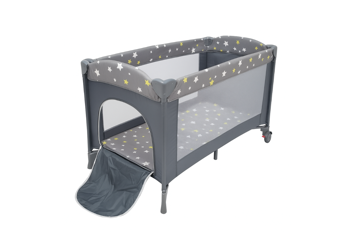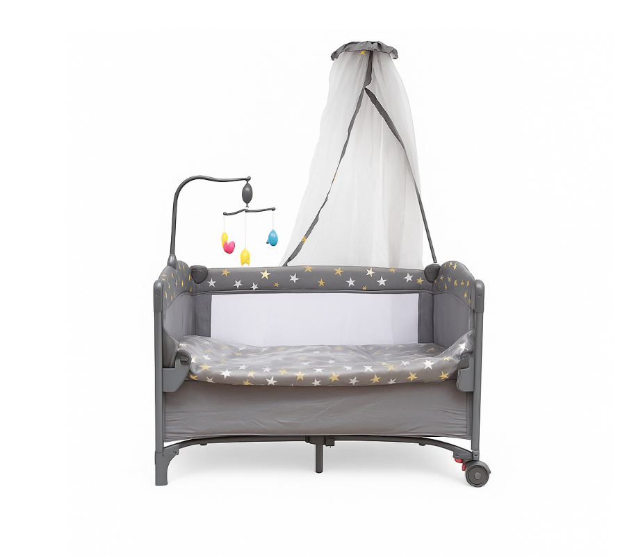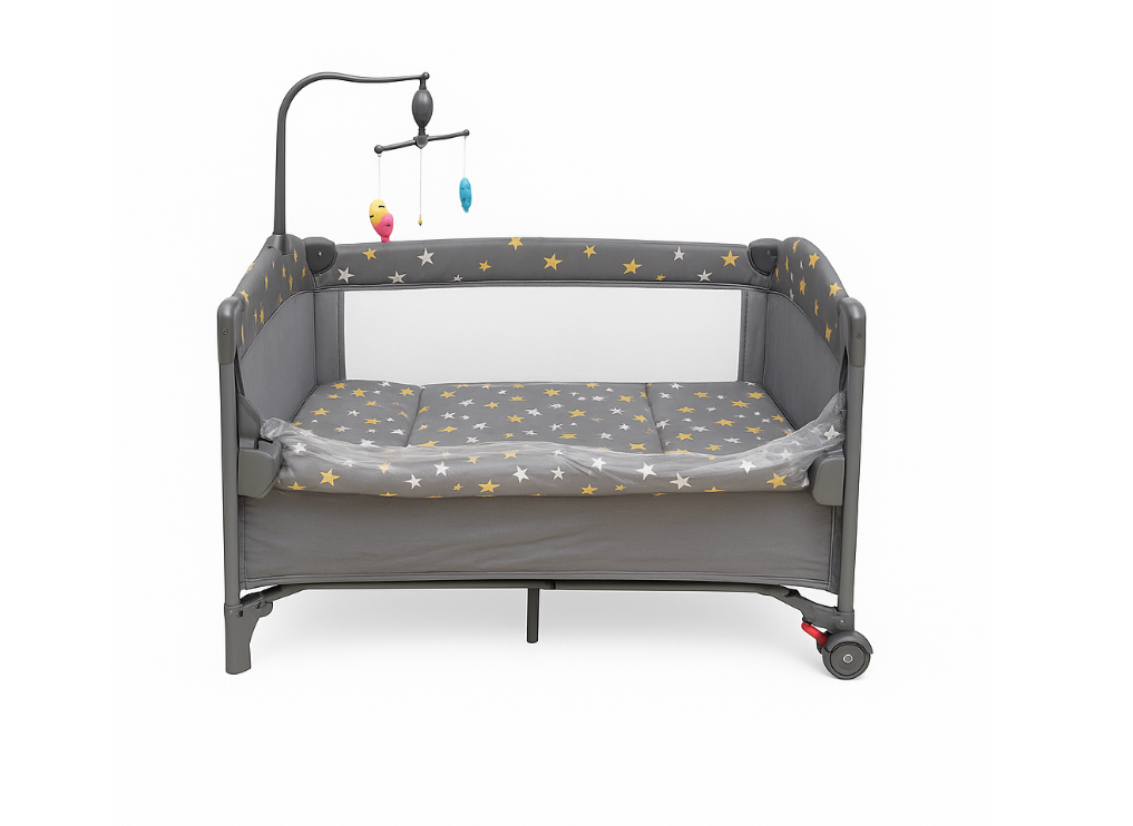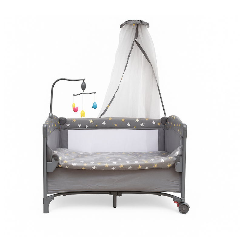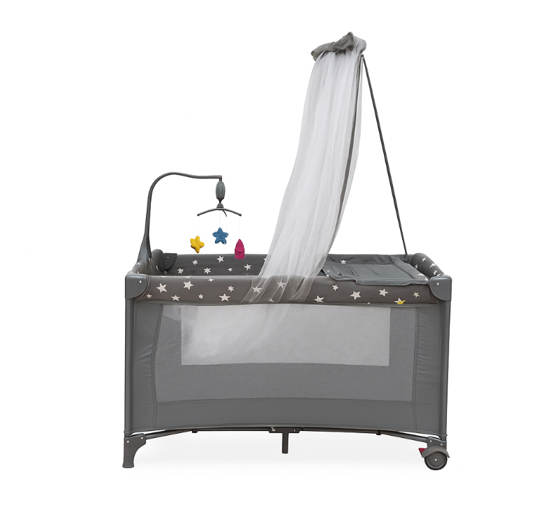 Patut bebe, 2 niveluri, cu laterala culisanta, baldachin cu suport inclus, masuta de infasat, gri