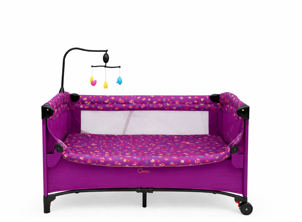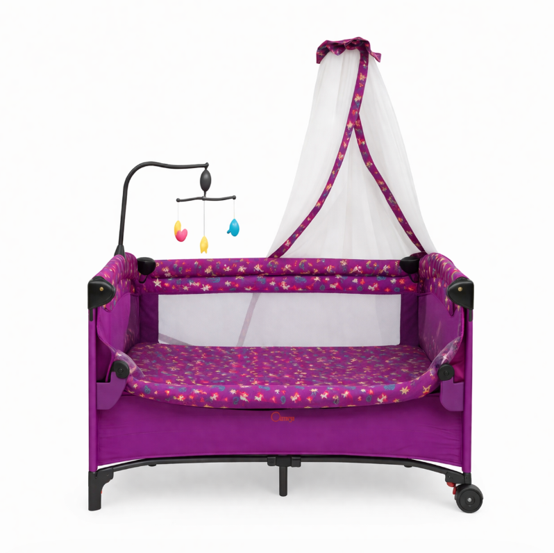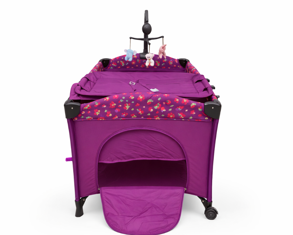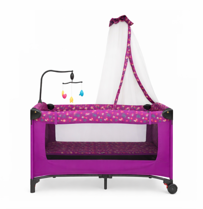 Patut bebe, 2 niveluri, cu laterala culisanta, baldachin cu suport inclus, masuta de infasat, Mov