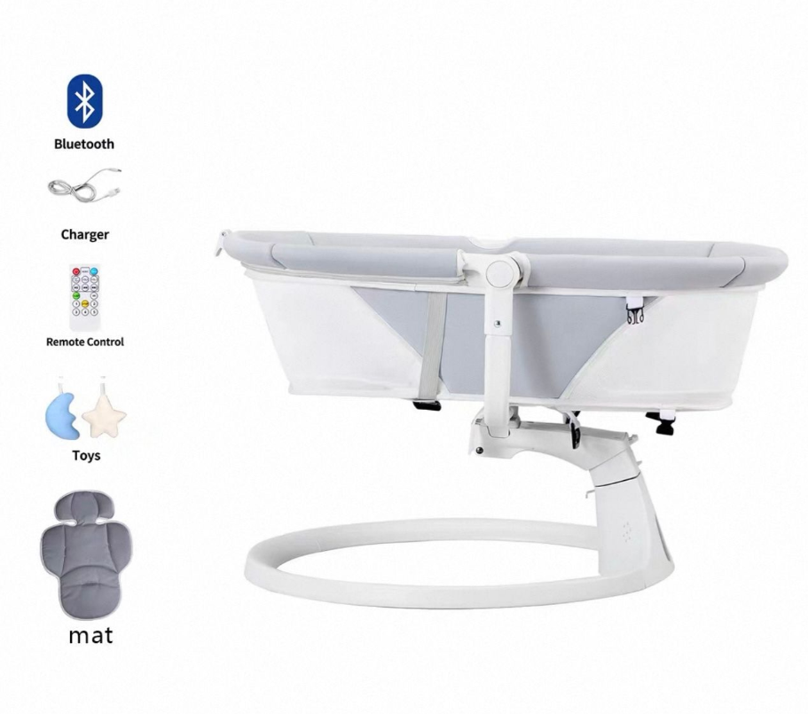 Leagan Electric, Balansoar si patut pentru bebelusi , 3 Trepte Balans, Muzical, Conexiune Bluetooth, Telecomanda, Jucarii de Plus, Cu Acoperis Rabatabil si Plasa insecte, Gri mat