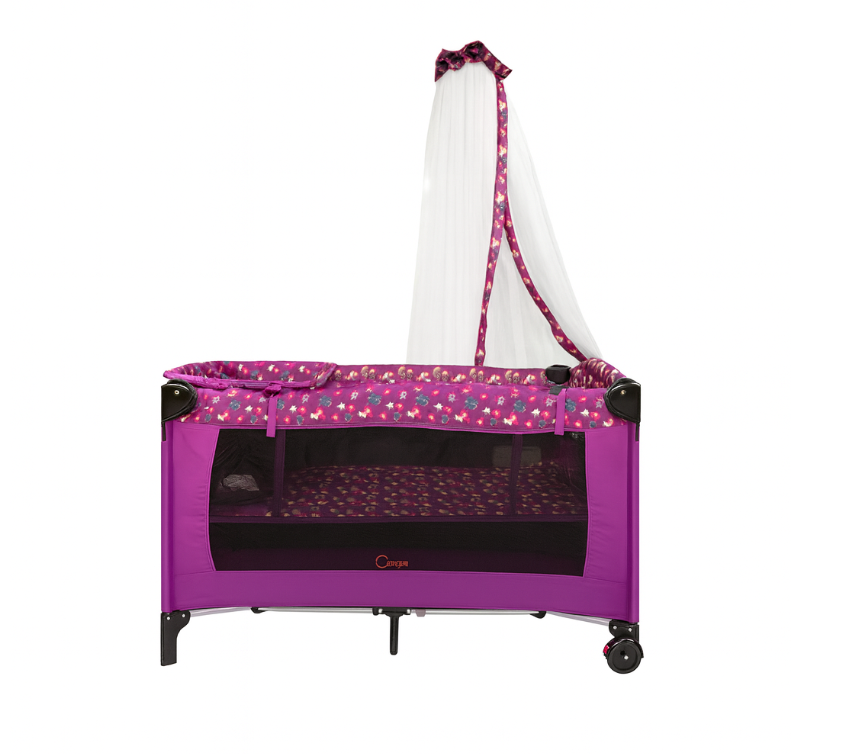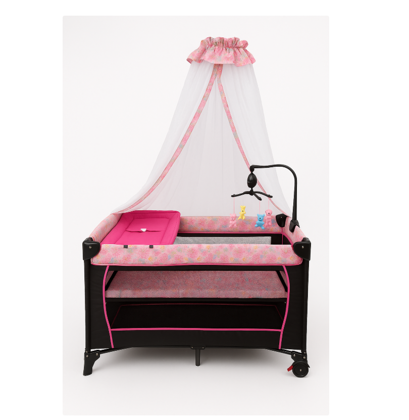 Patut bebe, 2 niveluri, cu laterala culisanta, baldachin cu suport inclus, masuta de infasat, roz