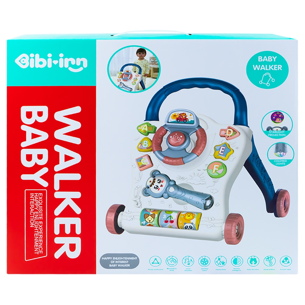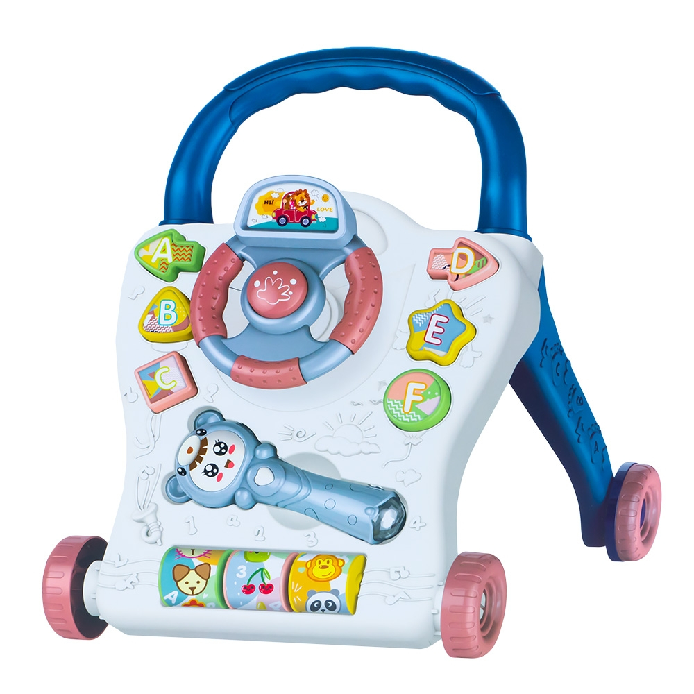 - Jucaria educativa, multifunctionala are diverse functii: este utilizata de catre copiii mici ca antemergator, are 6 spatii in care se pot fixa formele geometrice, dispune de volan rotativ, cu claxon functional, de asemenea de o jucarie zornaitoare detasabila, iar in partea de jos are 3 cilindri rotativi cu autocolante incantatoare, cu animale, fructe, cifre si litere.