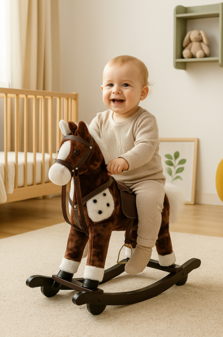 Calutul se balanseaza datorita miscarii inainte-inapoi a copilului, pe cele doua baze atasate.