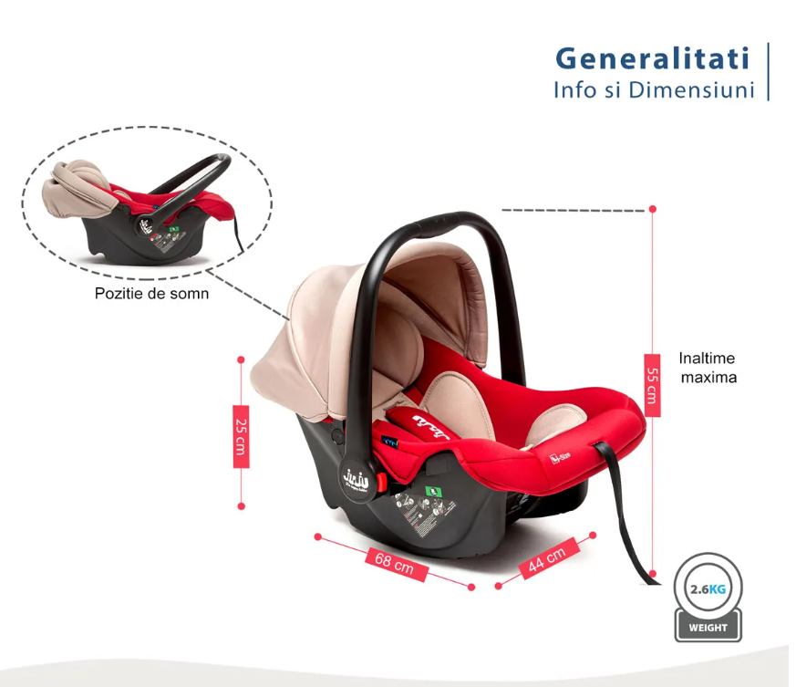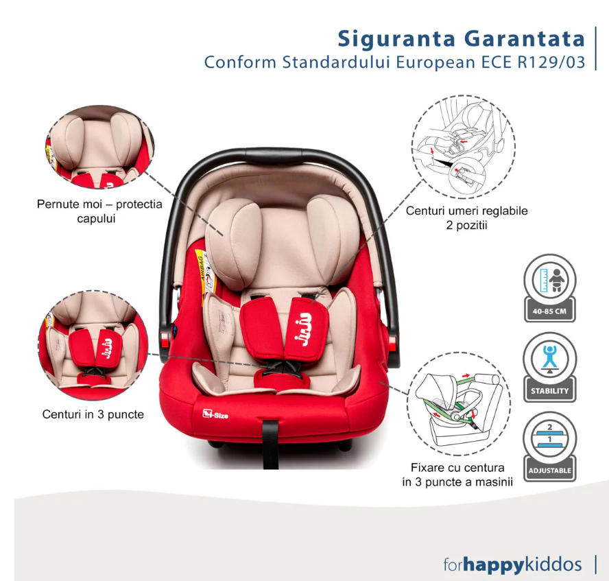 Produsul respectă cel mai recent standard de siguranță R129, cunoscut și sub numele de i-Size, oferind protecție la cel mai înalt nivel, conform celor mai stricte standarde europene. Este potrivit pentru bebelușii cu înălțimea între 40 și 85 cm, fiind ideal pentru utilizare din prima zi și până în jurul vârstei de 15 luni.