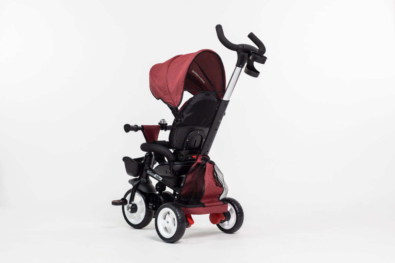 Pe masura ce creste, toate elementele tricicletei se detaseaza astfel ca, in cele din urma, produsul va putea fi utilizat ca o tricicleta clasica cu sezut, ghidon si pedale.