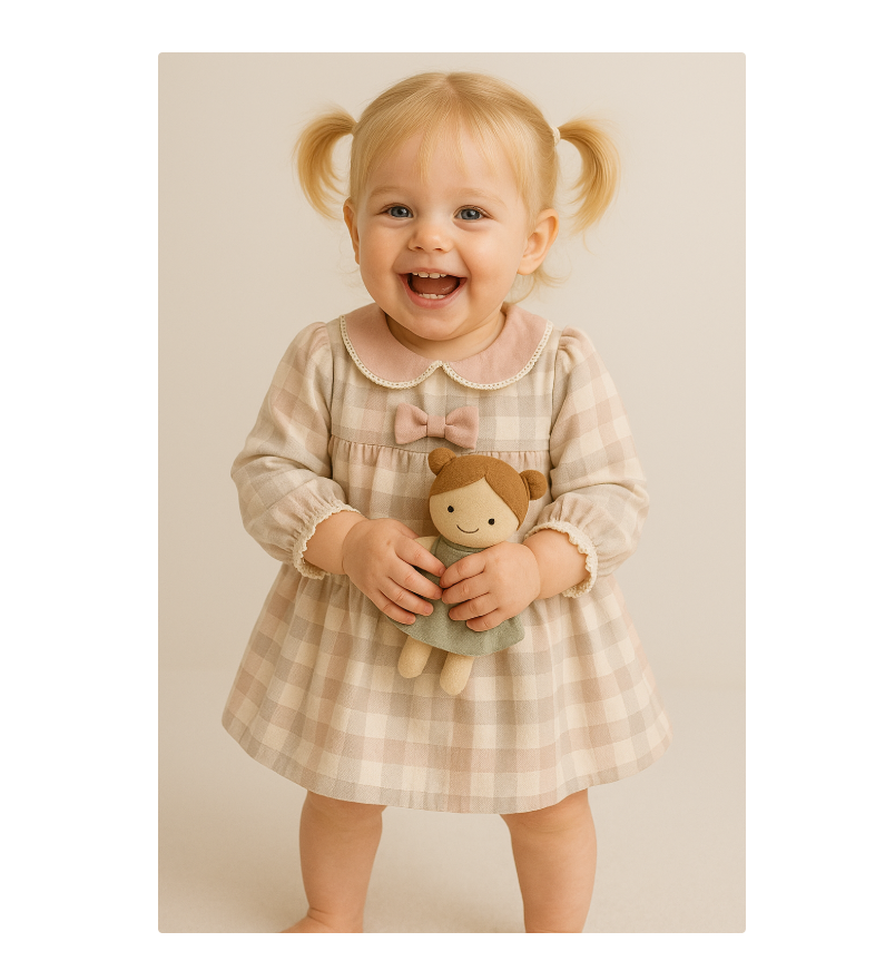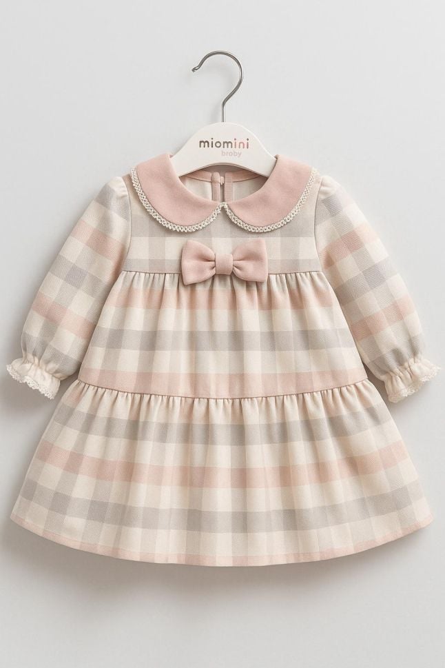 Model: Rochiță cu carouri pastelate (bej, roz pal, gri deschis).