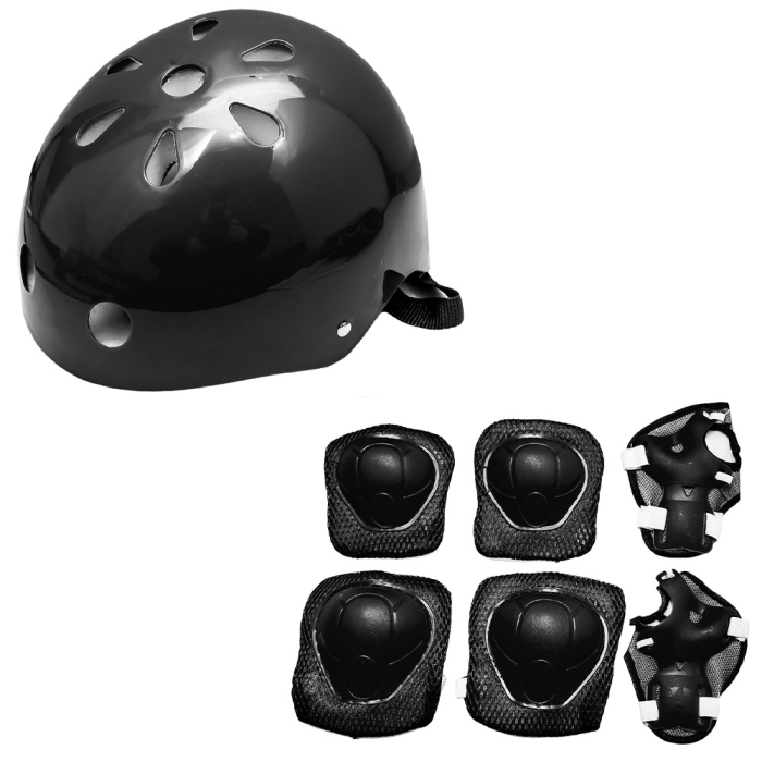 - Setul ce ofera protectie contine 1 casca, 2 cotiere, 2 genunchiere si 2 protectii pentru incheietura mainii, insotite de 1 sac din plasa.