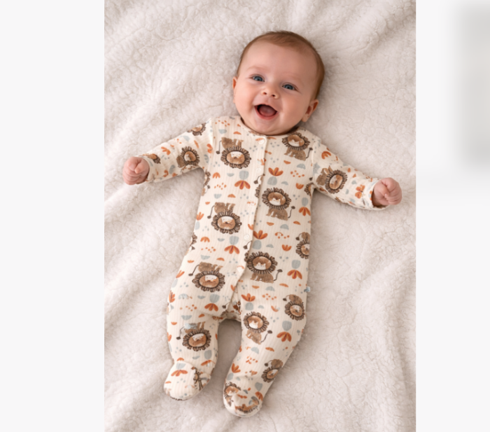 Designul include capse frontale pentru o îmbrăcare ușoară și rapidă, iar papucii integrați mențin picioarele bebelușului calde și protejate. Produsul este sigur pentru bebeluși, fiind fabricat fără substanțe periculoase sau alergene.