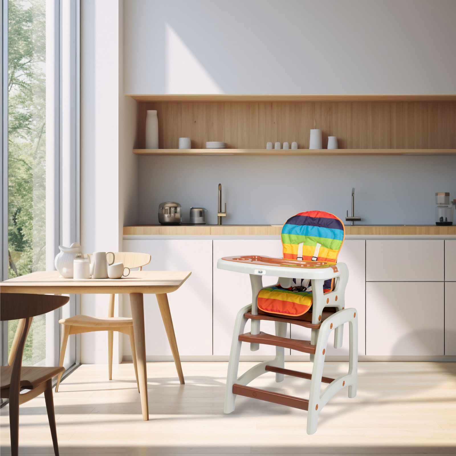 Eat&Play este prevazut cu husa si tavita detasabile si lavabile. Hamurile de siguranta cu prindere in 5 puncte garanteaza siguranta copilului dumneavoastra in timpul mesei. Avantajele majore ale acestui scaun fata de modelele pliante sunt stabilitatea si rezistenta in timp. Scaunul este certificat in conformitate cu normele europene EN 14988-1+2:2006+A1:2012.