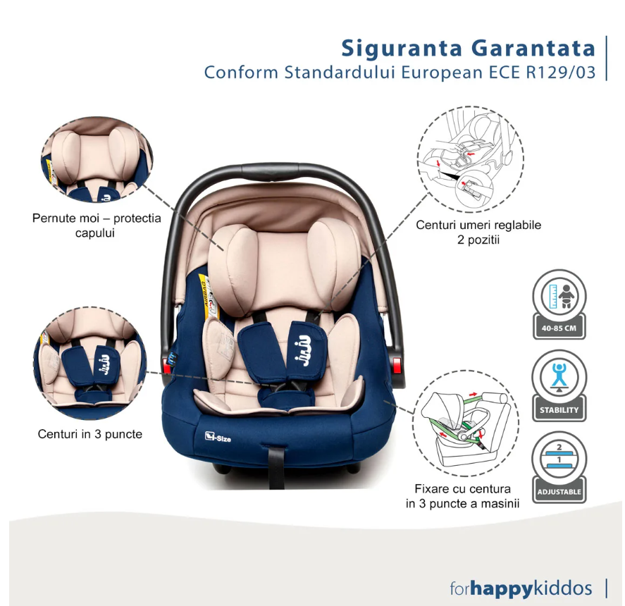 Produsul respectă cel mai recent standard de siguranță R129, cunoscut și sub numele de i-Size, oferind protecție la cel mai înalt nivel, conform celor mai stricte standarde europene. Este potrivit pentru bebelușii cu înălțimea între 40 și 85 cm, fiind ideal pentru utilizare din prima zi și până în jurul vârstei de 15 luni.