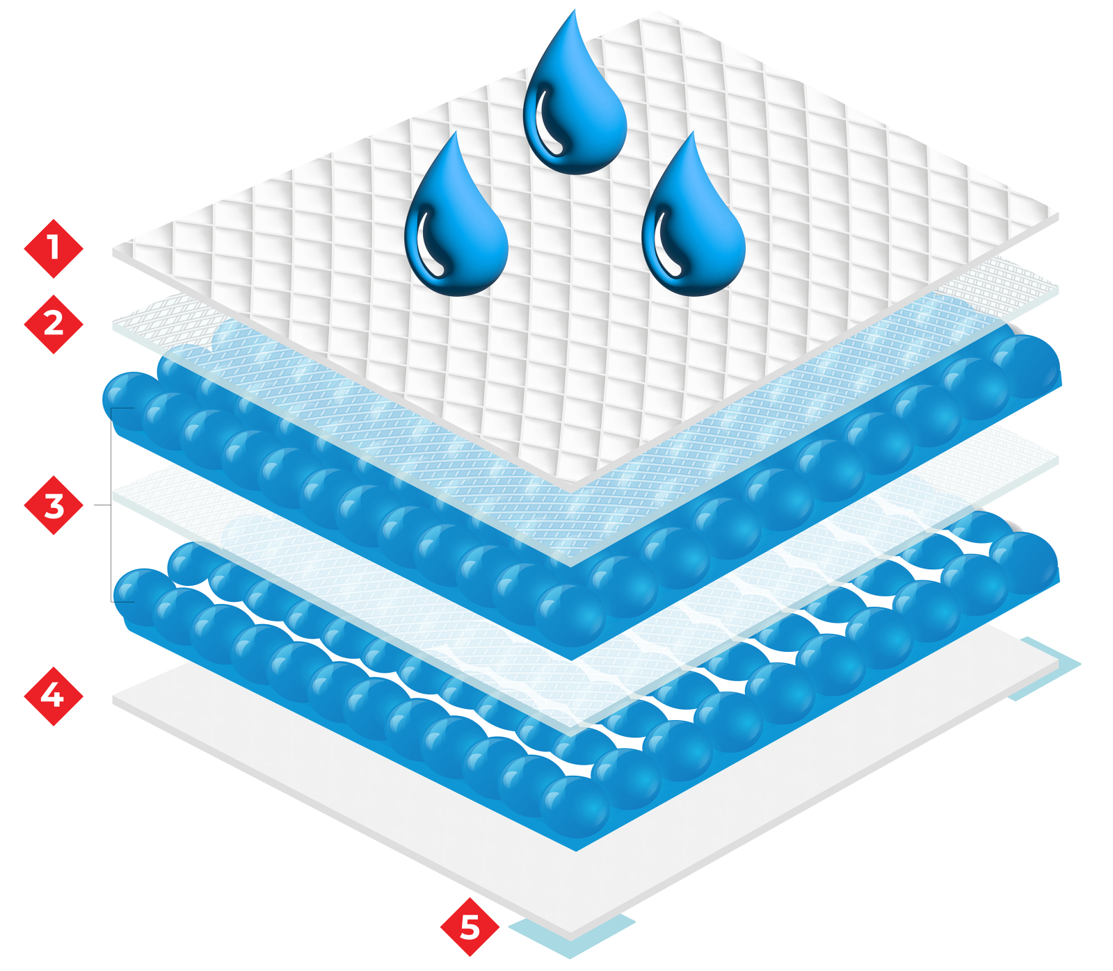 Tehnologia SAP (Super Absorbent Polymer) împreună cu straturile de celuloză, transformă rapid lichidul în gel și îl reține în interiorul structurii în 6 straturi high-tech, reducând umezeala de la suprafață și limitează apariția mirosurilor neplăcute.