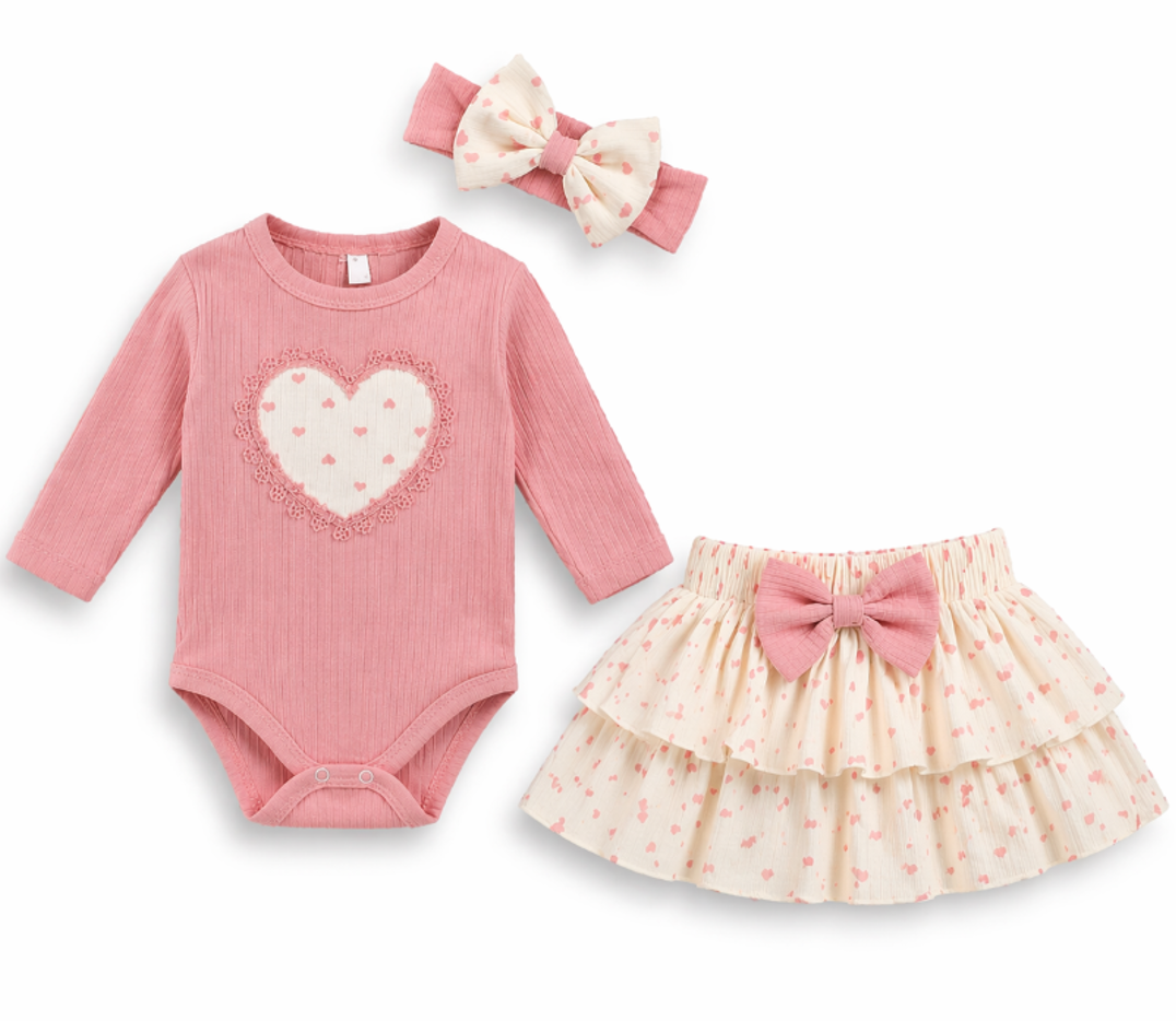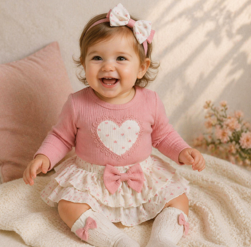 Fustița este separată de body, realizată din material ușor, cu imprimeu discret de inimioare și volane suprapuse, completată de o fundă decorativă în talie pentru un plus de stil.