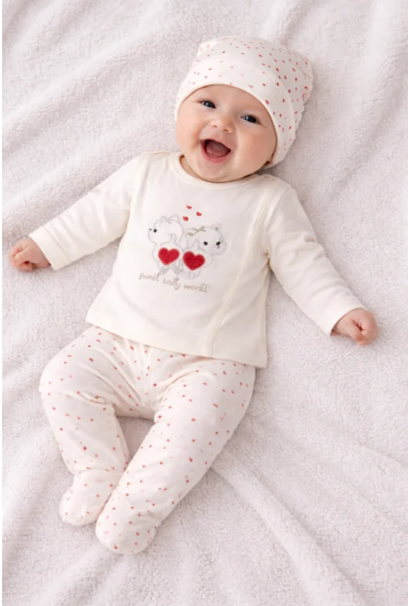 Set adorabil pentru bebeluși de 0-3 luni, compus din bluziță crem cu imprimeu colorat, pantaloni cu buline pastel și căciuliță asortată. Ținuta este ideală pentru nou-născuți, oferind confort și un design jucăuș, perfect pentru ședințe foto sau ținute de zi cu zi. Materialul moale și delicat este potrivit pentru pielea sensibilă a bebelușilor, iar culorile pastel creează un look modern și plăcut.