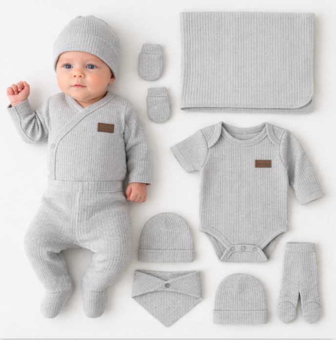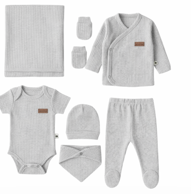 Perfect pentru primele luni, pentru scos din maternitate si pentru uzul zilnic, setul este compus din paturica, manusele, pantalonasi cu botos, bluzita, barbita, body si caciulita.