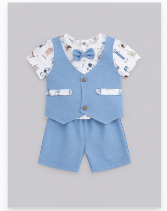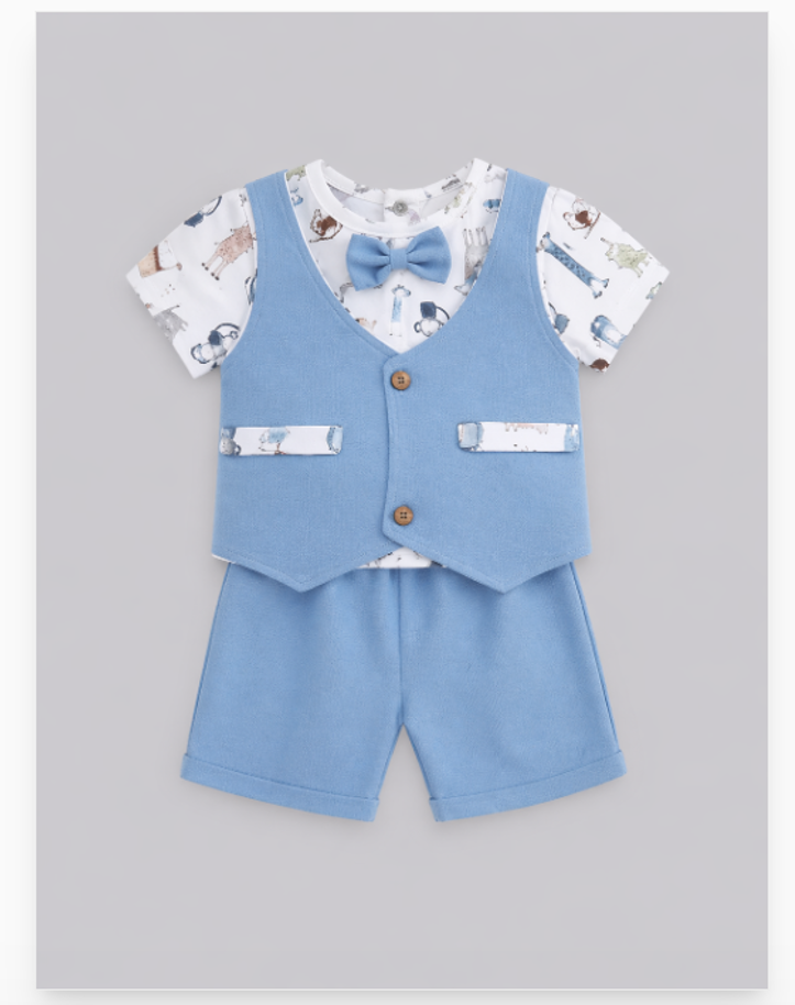 Alege un set complet pentru bebeluși, realizat din bumbac de calitate superioară, ideal pentru pielea delicată a celor mici. Acest outfit modern pentru băieți include tricou cu imprimeu, vestă elegantă, pantaloni comozi și papion asortat – combinația perfectă între confort și stil.